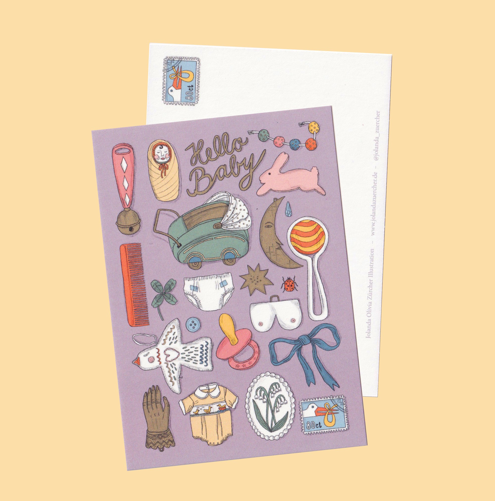Postkarte, Babykarte im A6 Format auf 300g Naturpapier, mit kleinem Briefmarkendetail auf der Rückseite, gestaltet von Jolanda Olivia Zürcher (www.jolandazuercher.de)